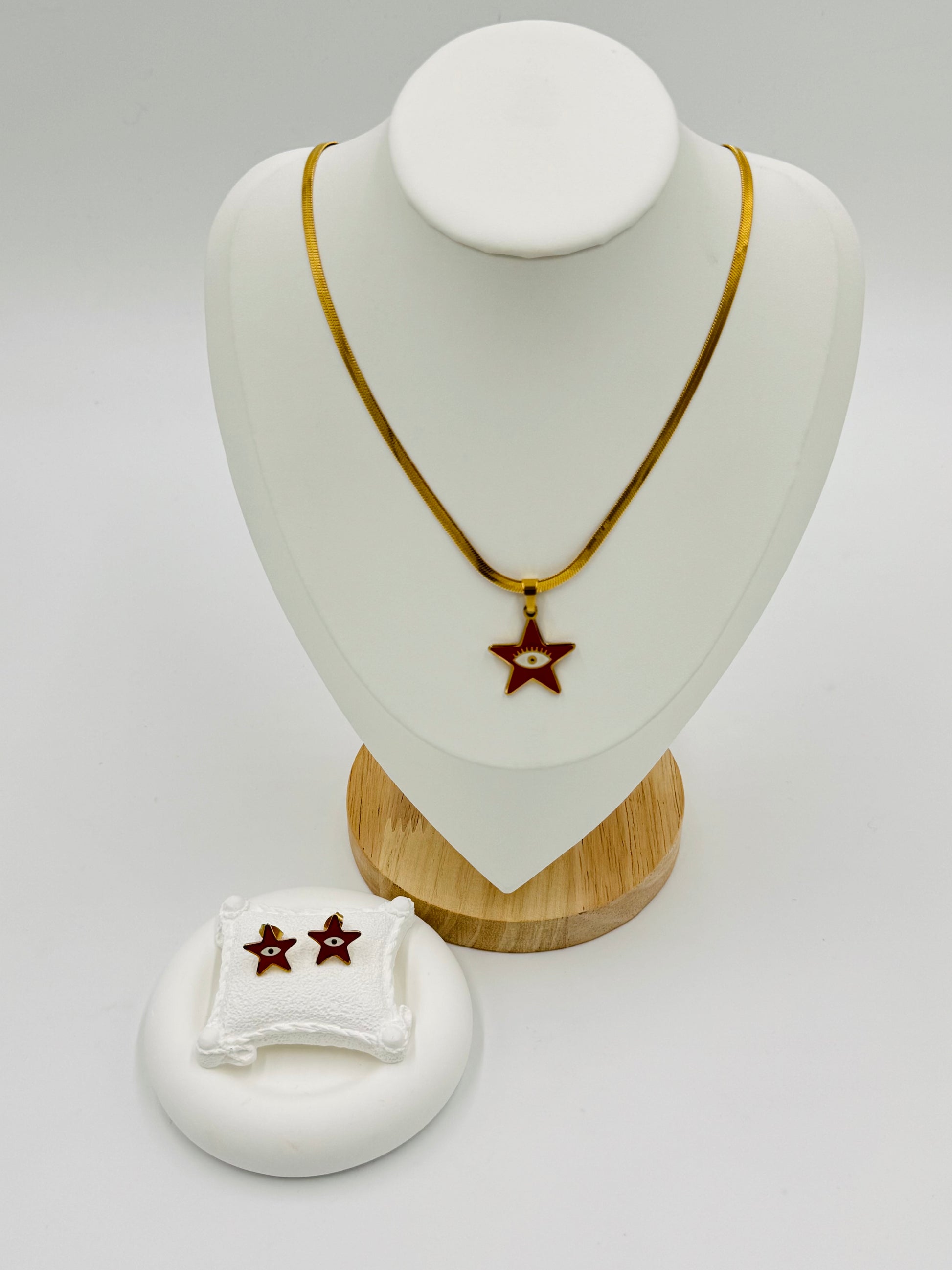 Make a bold fashion statement with this Red Star Necklace and Earring Set, featuring an eye-catching red star pendant with matching star earrings. Crafted with 18K gold plating, it combines a modern look with playful energy.